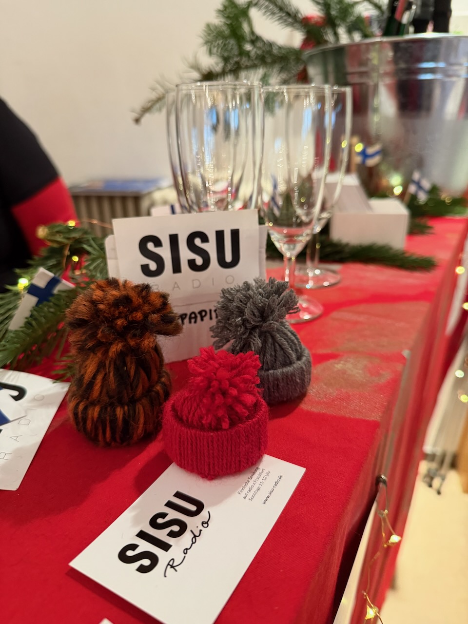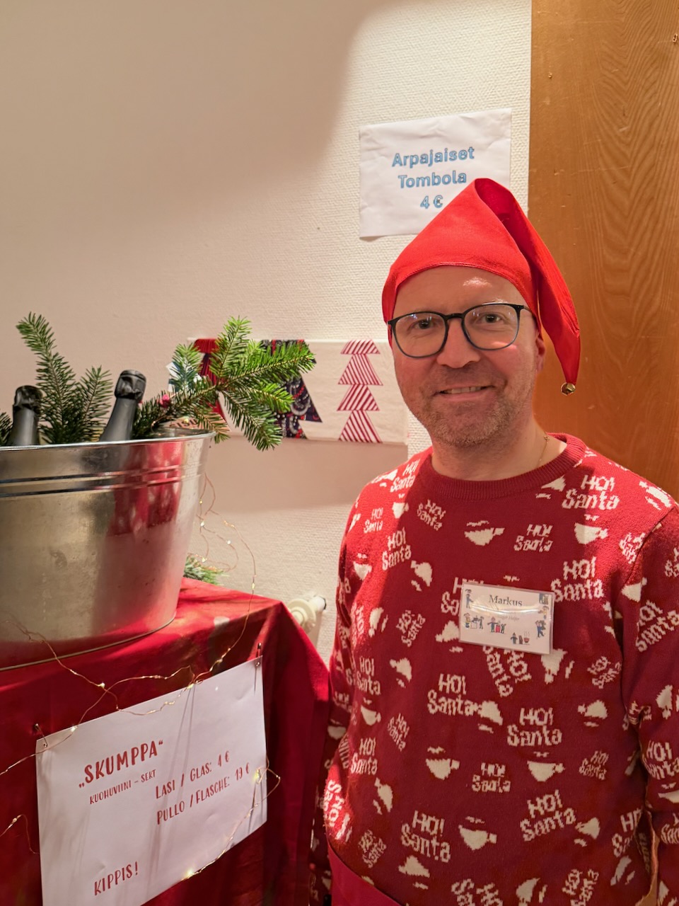 SKUMPPAKULMA on Frankfurtin suomalaisen seurakunnan joulumyyjäisten tapaamispaikka, missä nautitaan lasillinen kuohuvaa ja samalla tuetaan SISU-radion toimintaa. Joka vuosi saamme myös kommentteja saksalaisilta, jotka kertovat kuuntelevansa meidän ohjelmiamme vaikka eivät ymmärrä kielestä yhtäkään sanaa. Tänä vuonna avustimme seurakuntaa mainiolla menestyksellä arpojen myynnissä. Mukana tonttuilemassa uusi-Ulla, Aino, Suvi ja Ode. Kirsikin teki kiitettävää taustatyötä.
